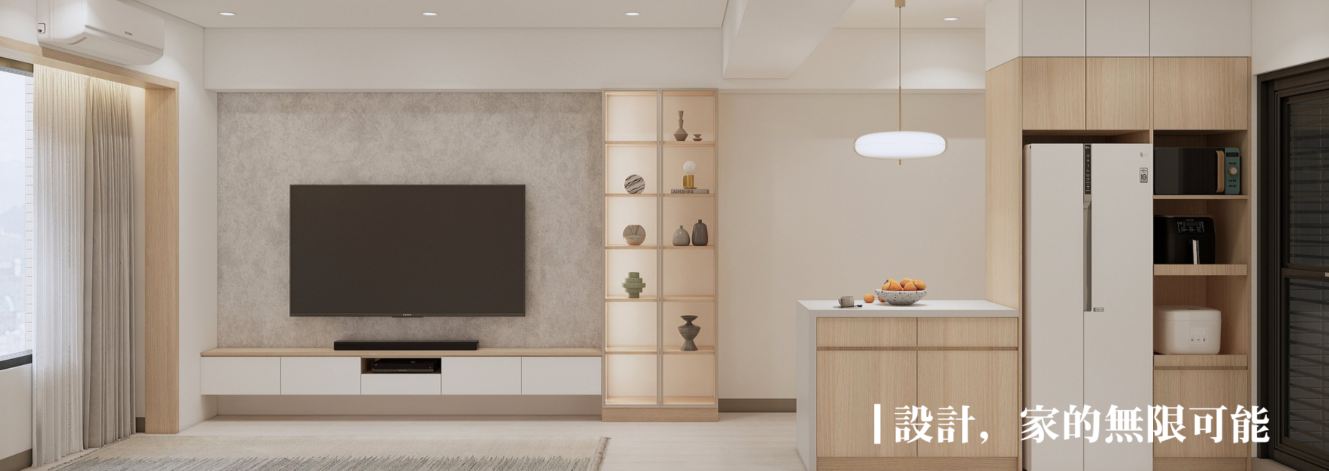 空間以日式現代為核心語彙,透過大量暖木色與低彩度材質鋪陳,營造溫潤而安定的生活場景。